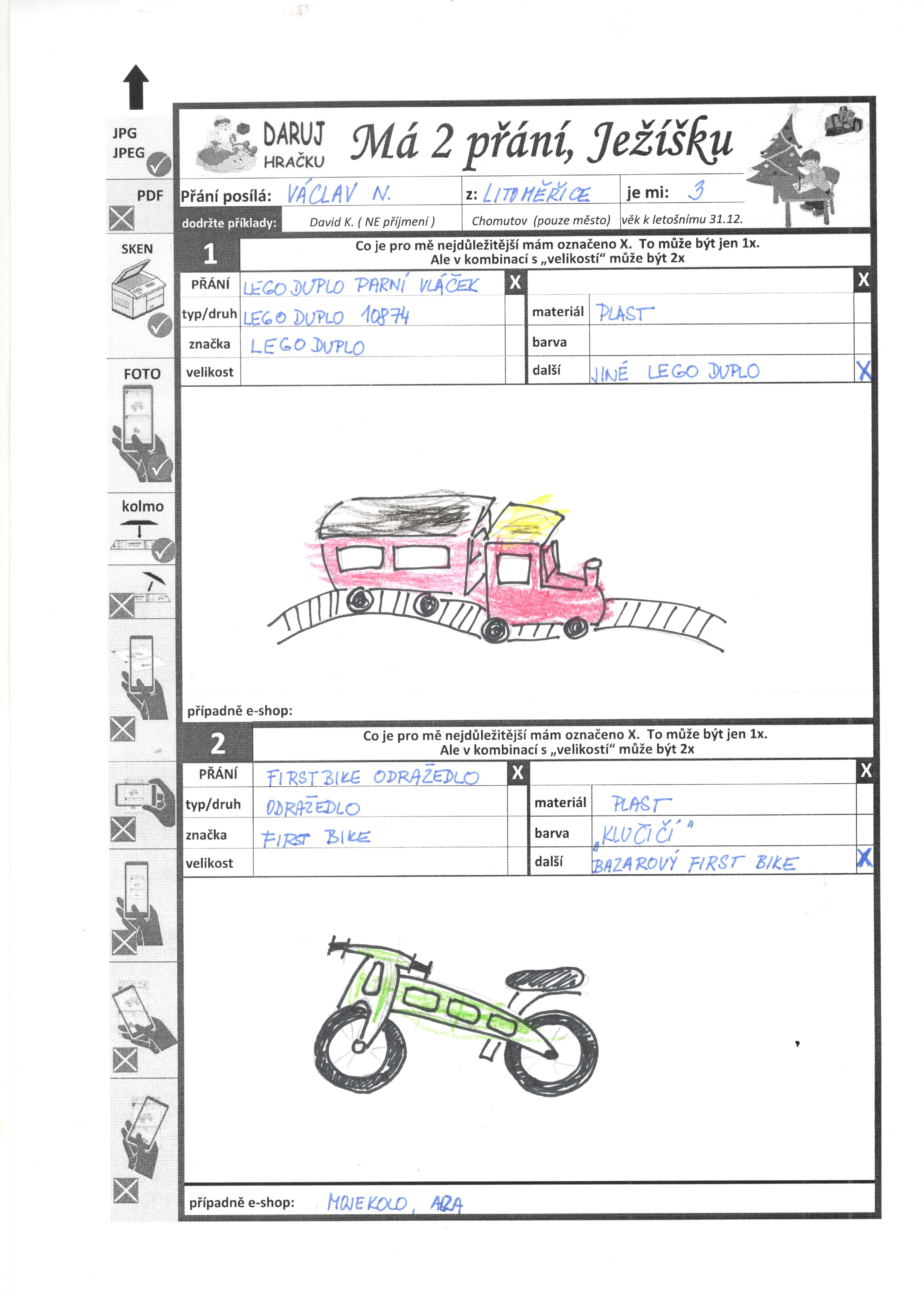 Zájmy: vláčky, Lego, knížky