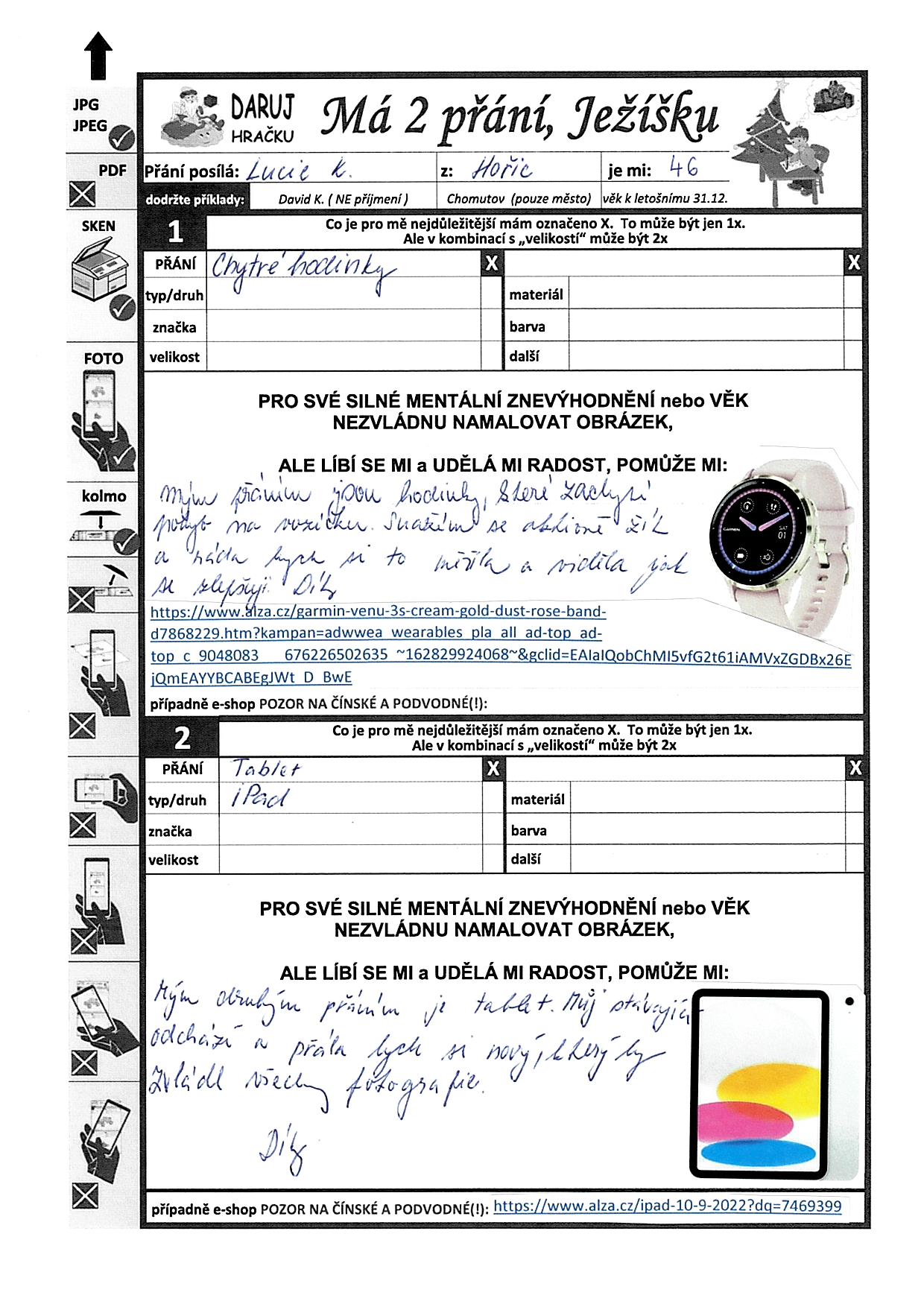 Poznámka: Jsem moc kamarádská, na invalidním vozíku jsem od narození. V domově jsem moc spokojená, našla jsem si tu i přítele. Ráda vyšívám, pracuji v domově v keramické dílně, počítač