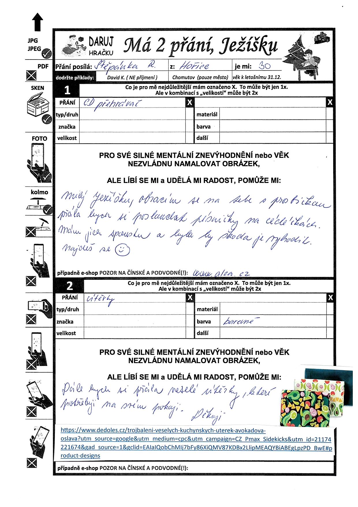 Poznámka: Jsem se svými postiženími plně závislá na péči druhé osoby, dárky, potřeby na malování by mi udělaly velkou radost. Mám diagnózu DMO, mám speciální invalidní vozík. Jsem ráda veselá, je mi teprve 29.