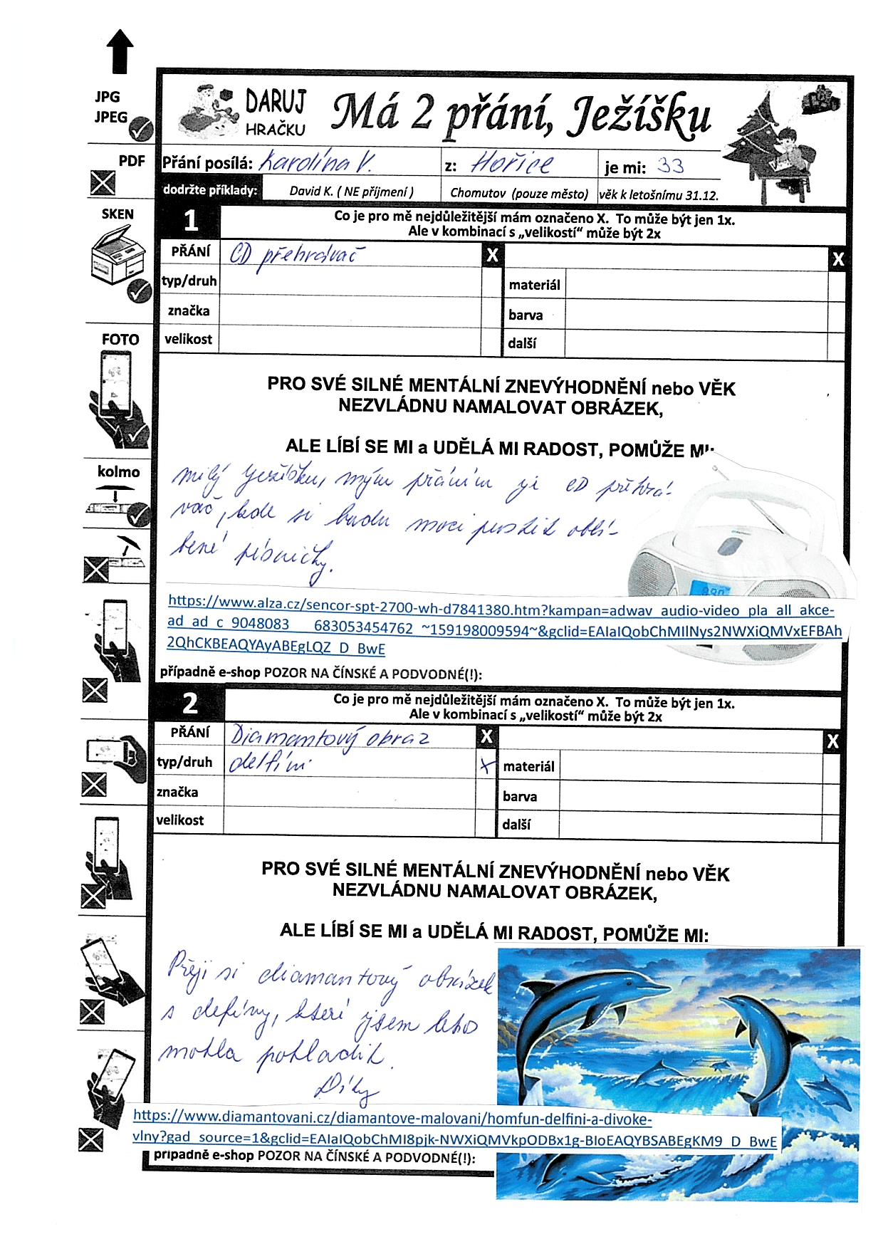 Poznámka: Jsem trvale odkázána na invalidní vozík. I přes svůj handicap ráda pomáhám druhým a ráda se líbím. Moc mě baví veškeré aktivity a akce v domově, mám ráda přírodu, zvířata.
