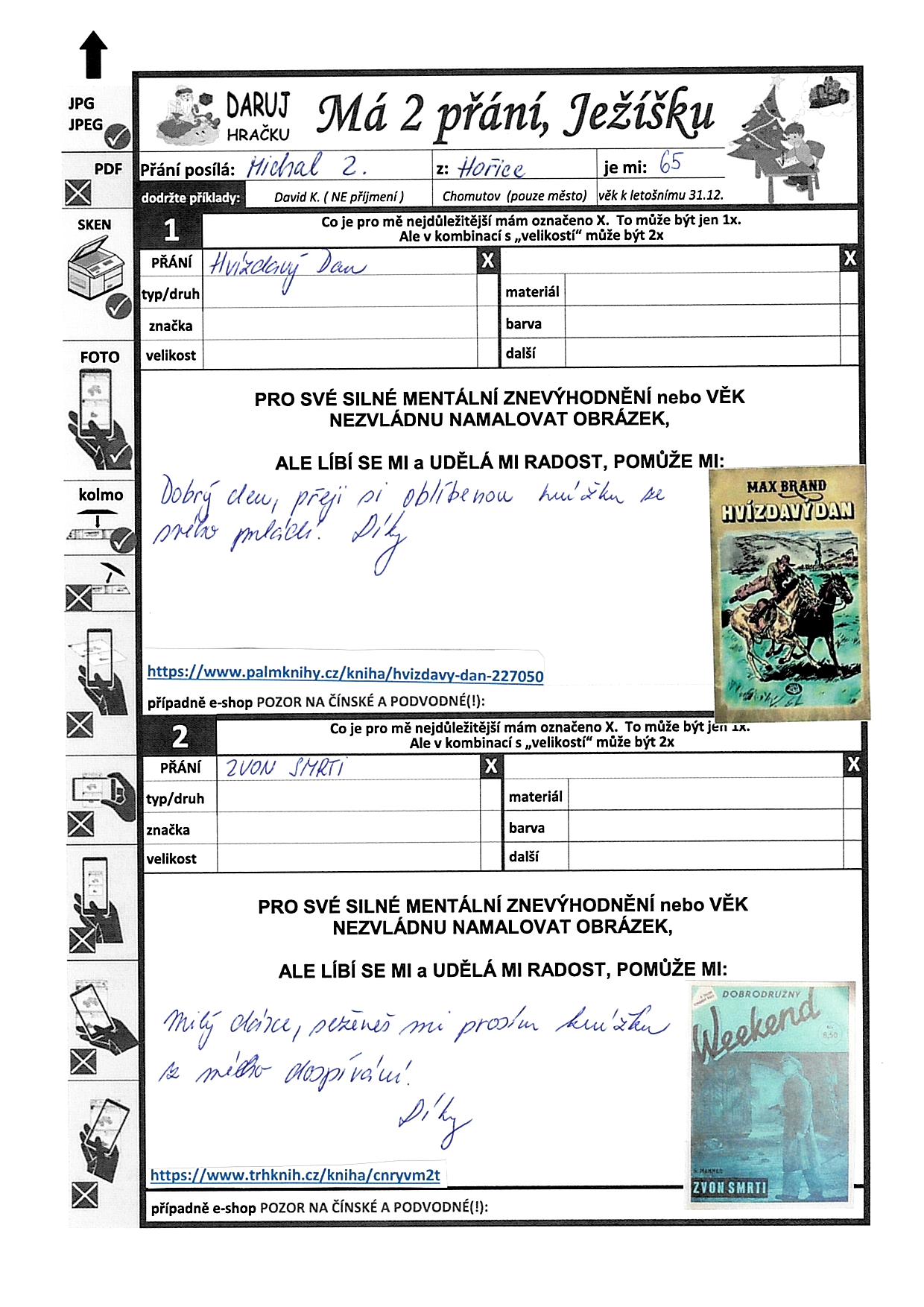 Poznámka: V zařízení jsem 40 let, kde vím že se o mne dobře postarají. Rád jezdím na svém skútru pro tělesně postižené do města a okolí. Jinak jsem na vozíku. Rád poslouchám hudbu, sbírám minerály.
