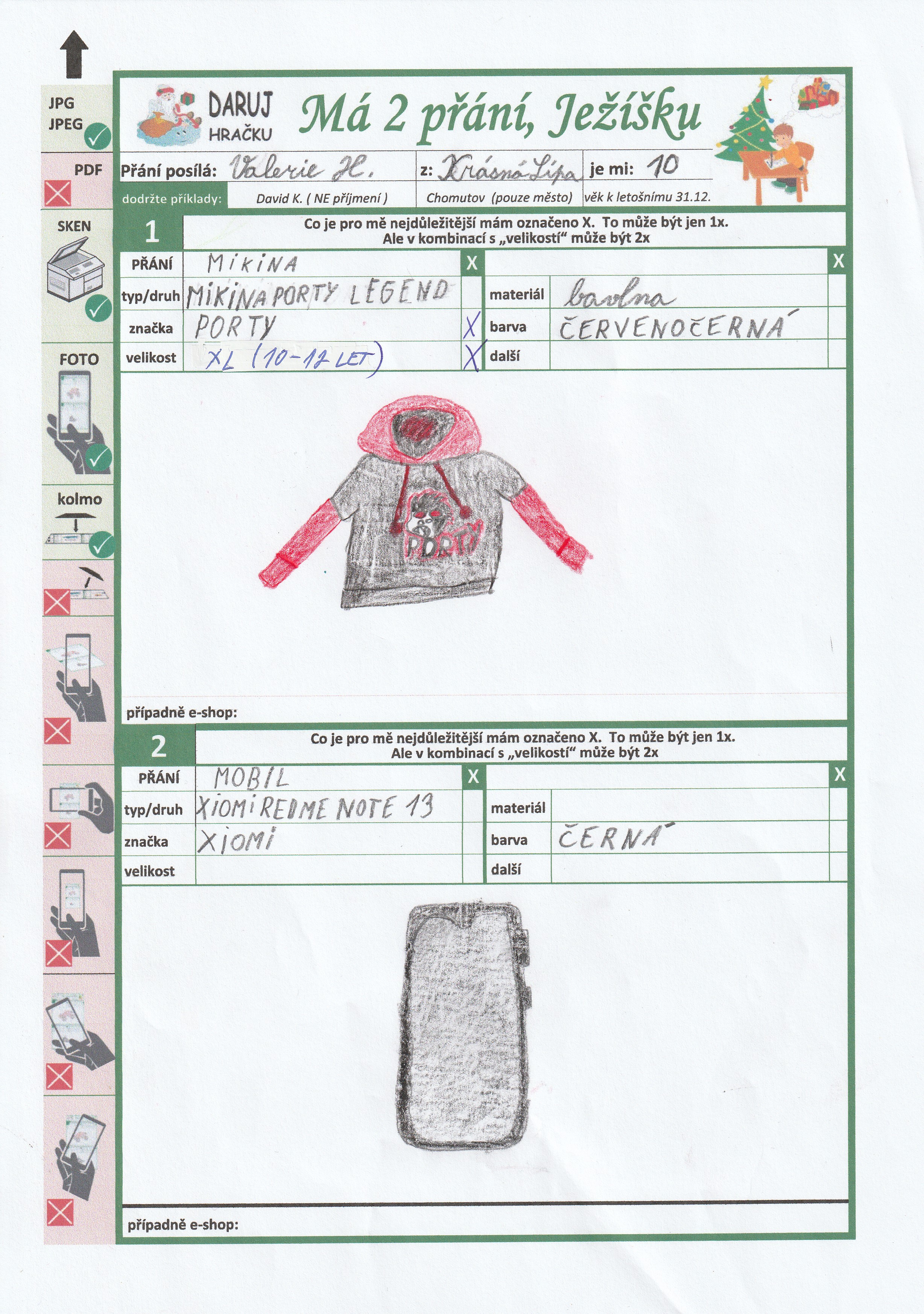 Poznámka: Ahoj Ježíšku, já bych si prosím moc přála mikinu Porty a mobilní telefon, abych si mohla pouštět písničky, fotit a psát s kamarádkami.