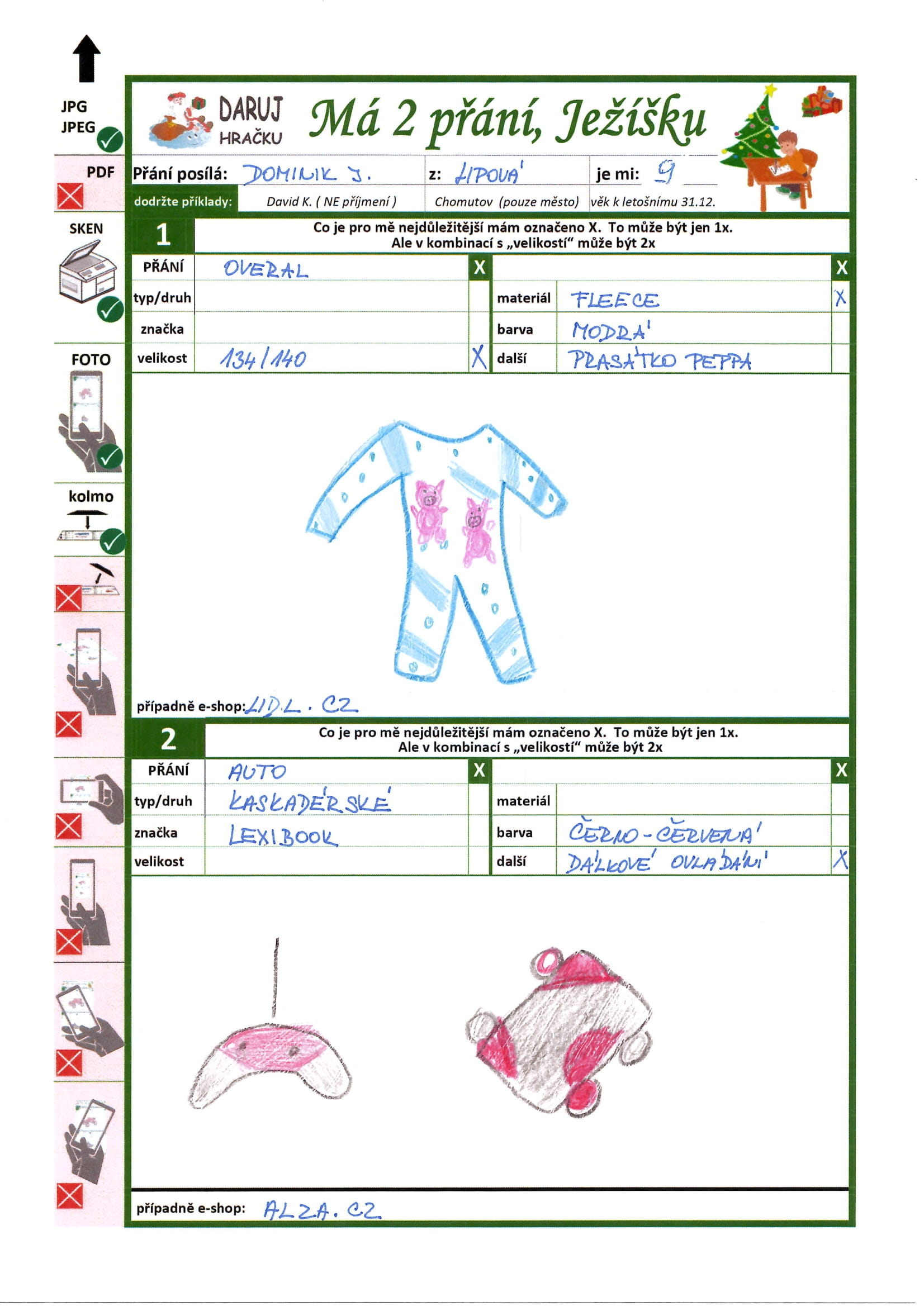 Zájmy: Hračky, stavebnice, auta, míčové hry, deskové hry, hudba, kolo